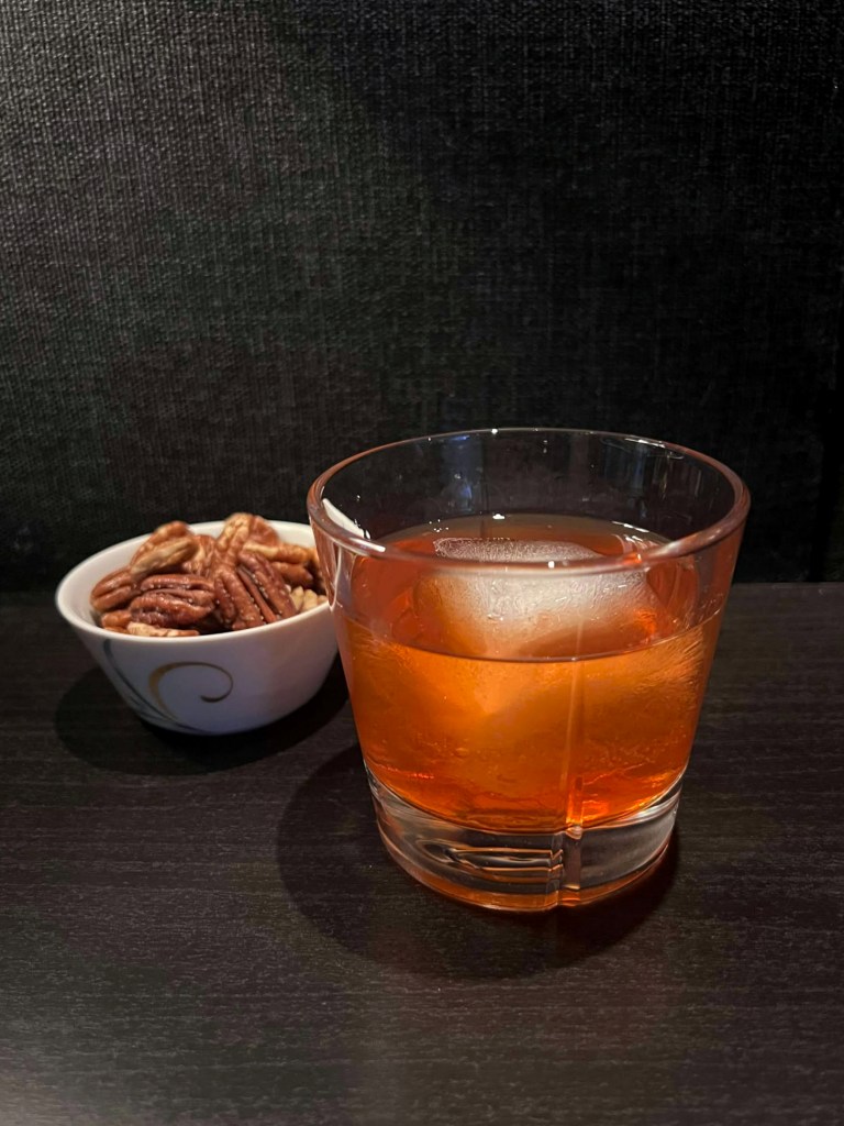 Mezcal Old Fashioned og salte pekannøtter. Denne satt som et skudd, vi finner salt, sødme, bitterhet og røyktoner som passer perfekt sammen! Terningkast 6!