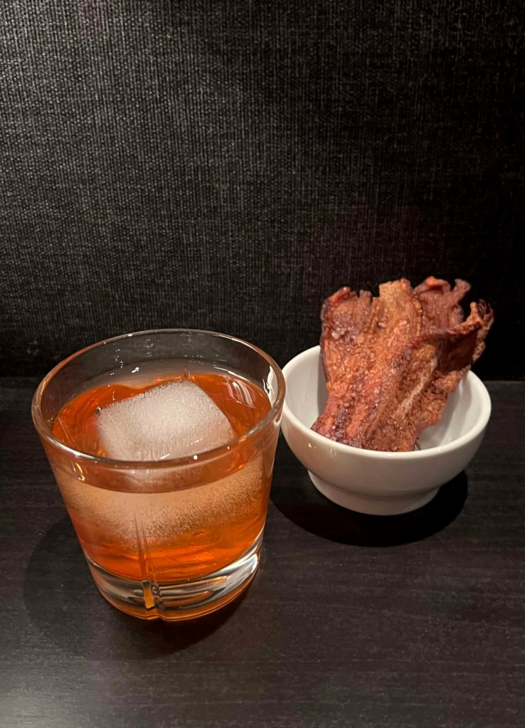 Mezcal Old Fashioned og bacon. Boken skriver ikke direkte bacon, men bacon fries og et baconpotetgull. Det blir uansett terningkast 5+ fra meg på bacon, salt, sødme, røyk – meget deilig match!