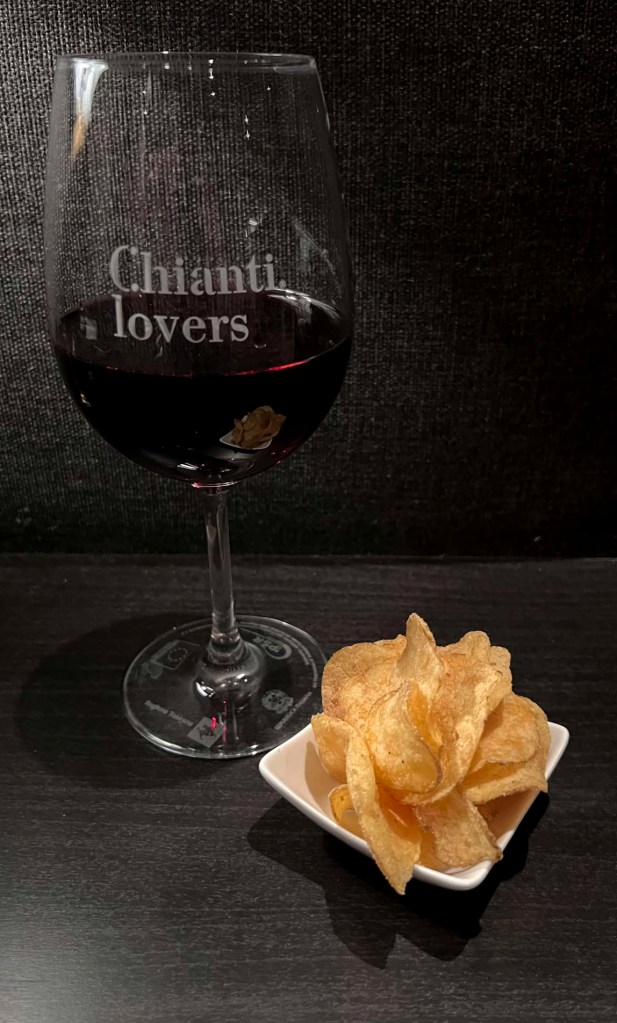 Chianti og parmesanchips. «What grows together stays together» sier vi ofte i vinbransjen, men det blir kun terningkast 4+. Vinen er litt for syrlig til potetgullet, men det er absolutt ingen dårlig match!