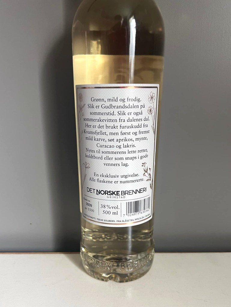 Dette er resultat av et samarbeid mellom akevittentusiaster i Gudbrandsdalen og Det Norske Brenneri. Her er det brukt furuskudd fra Kvamsfjellet, men først og fremst mild karve, søt aprikos, mynte, Curaçao og lakris.
