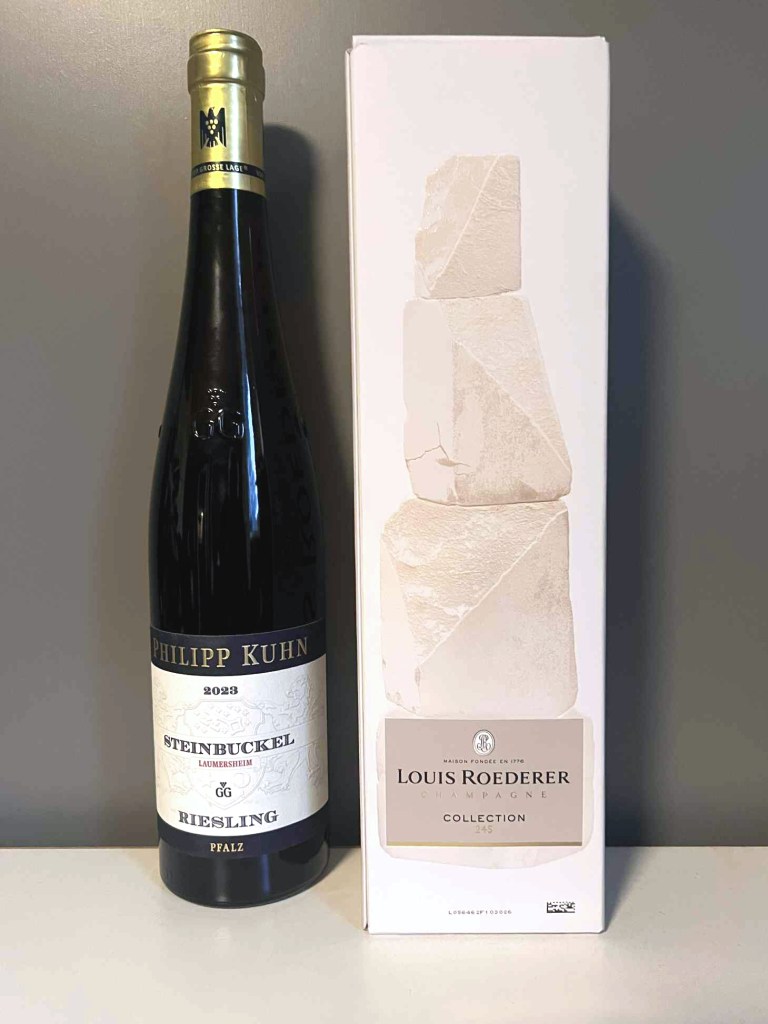 Philipp Kuhn Steinbuckel Riesling Trocken GG 2023: Konsentrert og innbydende nese, epler, sitrus, florale hint, mineraler og hint av petro. Den er rik på smak, ung, fruktig med god syre, lang og tørr utgang. En utmerket ung GG med et meget godt potensiale. 90p