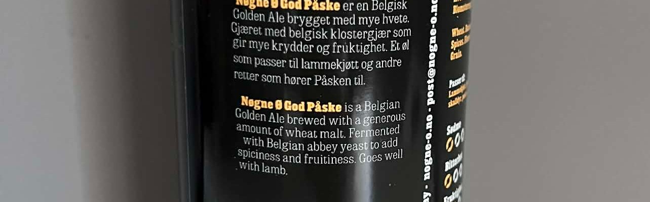 Nøgne Ø God Påske (Golden Strong Ale 7.5%): Innbydende nese med fruktige hvete-toner, malt, sitrus, florale toner, krydder og humlehint. Den er fyldig, følger nesen, en god kombinasjon av hveteøl og belgisk trippel, lang og lett bitter utgang. Et forfriskende øl med tyngde, fin i solveggen og til spekemat.