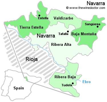 Navarra har store klimatiske forskjeller, området har lenge vært kjent for sine garnachabaserte rosèviner. Det har 5 underområder: Tierra Estella (reserva og gran reserva rødviner – vanskelig klimatisk), Valdizarbe (kraftige rødviner, lagringsdyktige hvitviner), Baja Montana (saftige og friske rød- og rosèviner), Ribera Alta (saftige og fyldige, alkoholrike viner) og Ribera Baja (mye kraftige og fargerike viner, end del gammel garnacha).