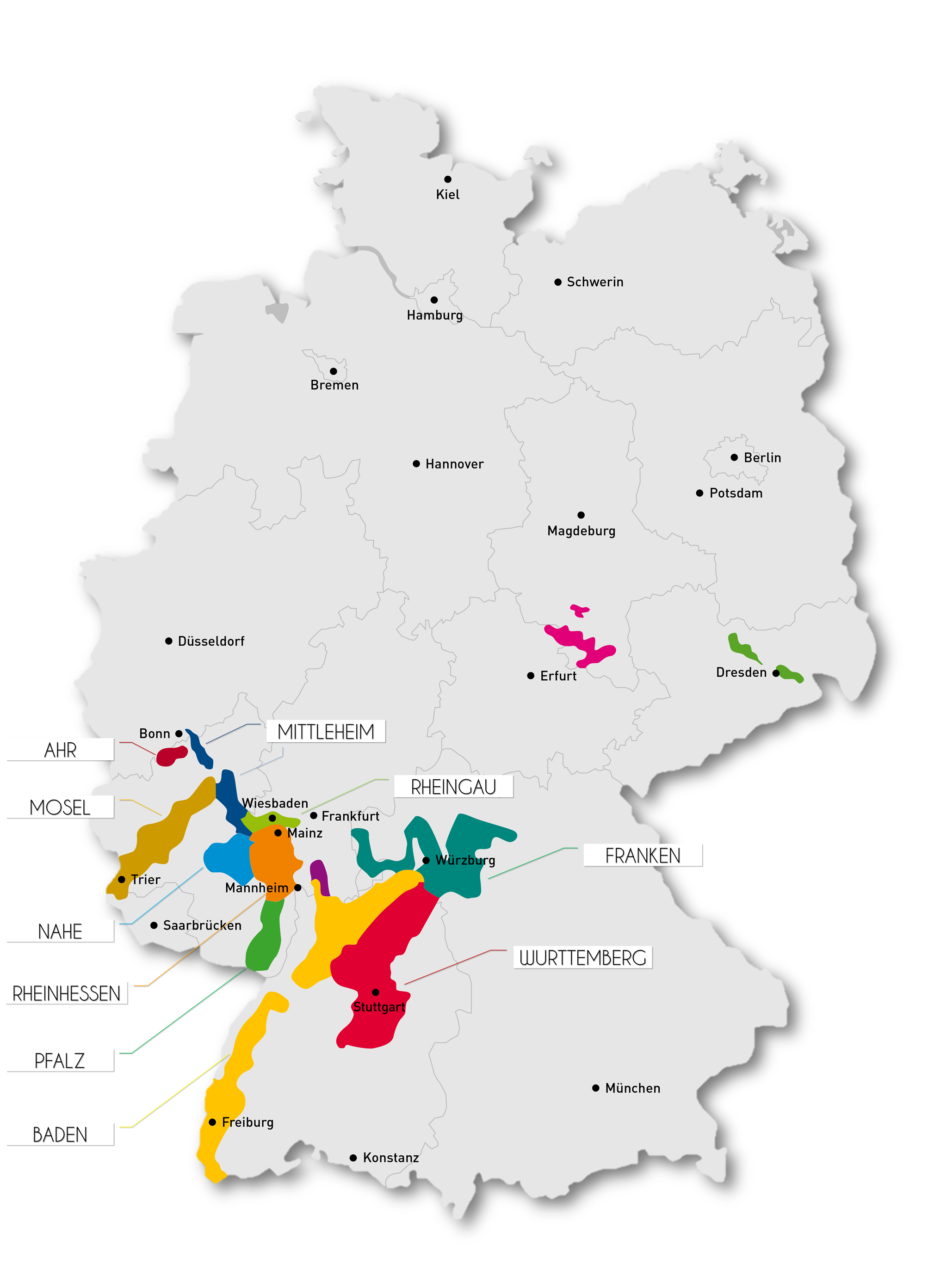 Tyskland har 13 vinregioner (17 vinproduserende distrikter); Rheinhessen, Rheingau, Mosel, Pfalz, Baden, Franken, Württemberg, Nahe, Saale-Unstrut, Ahr, Sachsen, Mittelrhein og Hess. Bergstrasse.